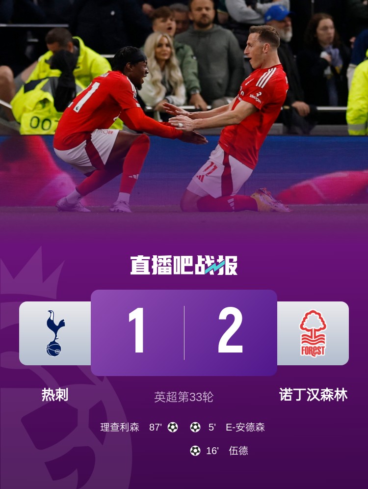 04月22日讯 英超第33轮,诺丁汉森林2-1击败热刺,33轮后拿下60分排在英超第3位。